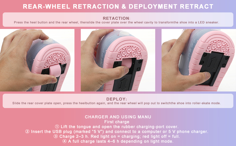 - Open: Push open the heel lid, then press the button of heel to pop out the rear wheels